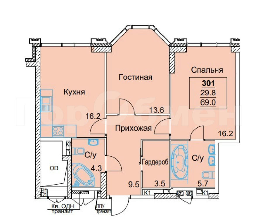 Общая: 69 м2